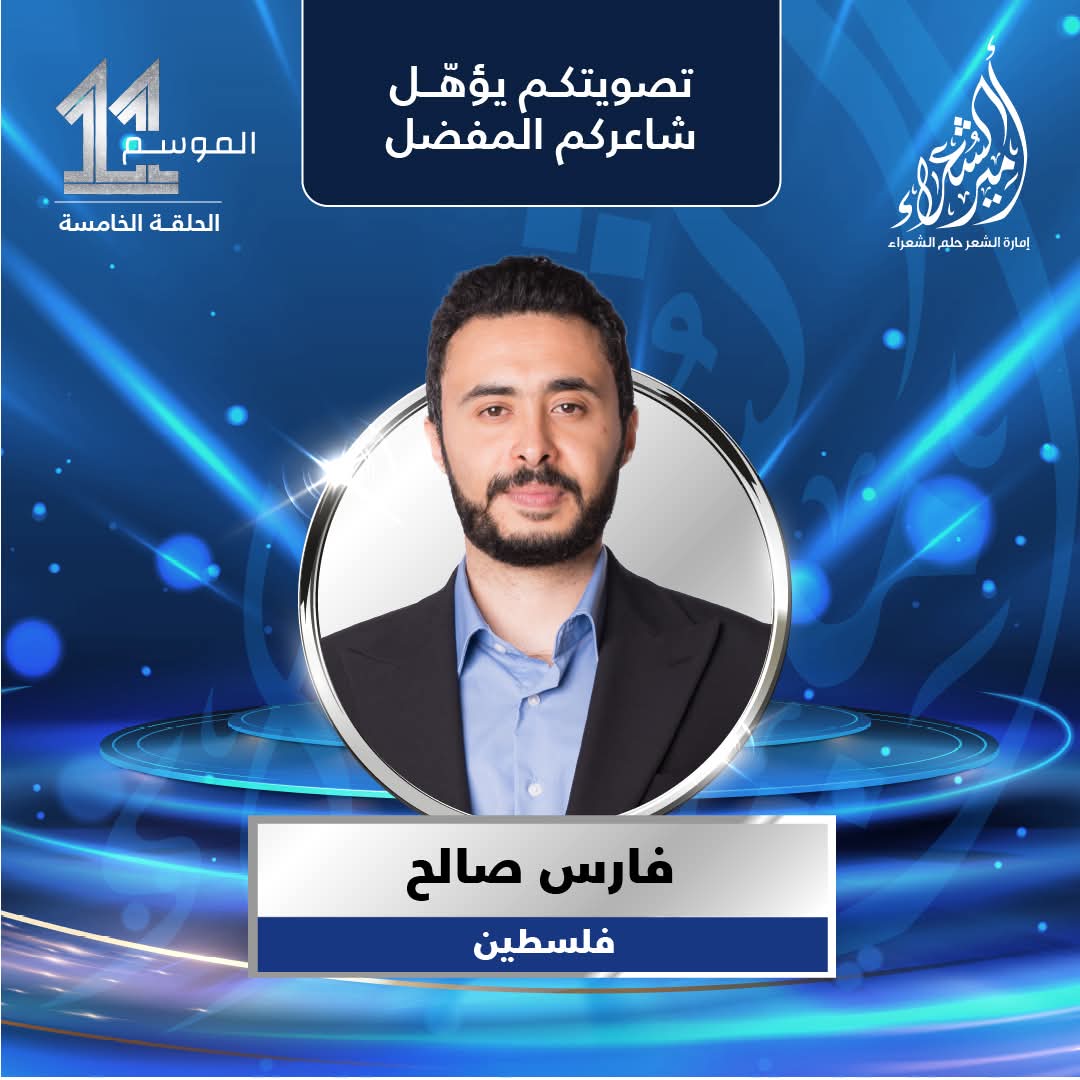 يشارك الشاعر الفلسطيني فارس صالح في النسخة الحالية من مسابقة “أمير الشعراء”، ممثلًا صمود الشعب الفلسطيني وصوتًا للأمة العربية في واحدة من أبرز المحافل الشعرية.