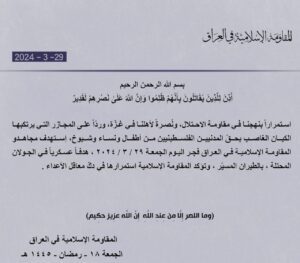 وقبل أيّام، استهدفت المقاومة الإسلامية في العراق موقع “سبير” العسكري الإسرائيلي، وقاعدة “عوبدا” الجوية الإسرائيلية (المنطقة الجنوبية) في داخل الأراضي الفلسطينية المحتلة.