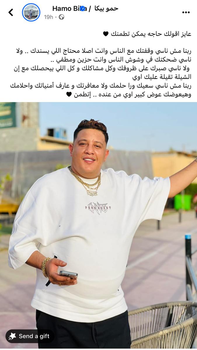 وكان حمو بيكا قد نشر مؤخرًا رسالة عبر حسابه على وسائل التواصل الاجتماعي، جاء فيها: “عايز أقولك حاجة يمكن تطمنك، ربنا مش ناسي وقفتك مع الناس وأنت أصلاً محتاج اللي يسندك، ولا ناسي ضحكتك في وشوش الناس وأنت حزين ومطفي، ولا ناسي صبرك على ظروفك وكل مشاكلك وكل اللي بيحصلك مع إن الشيلة تقيلة عليك أوي، ربنا مش ناسي سعيك ورا حلمك ولا معافرتك وعارف أمنياتك وأحلامك وهيعوضك عوض كبير أوي من عنده، إتطمن”.