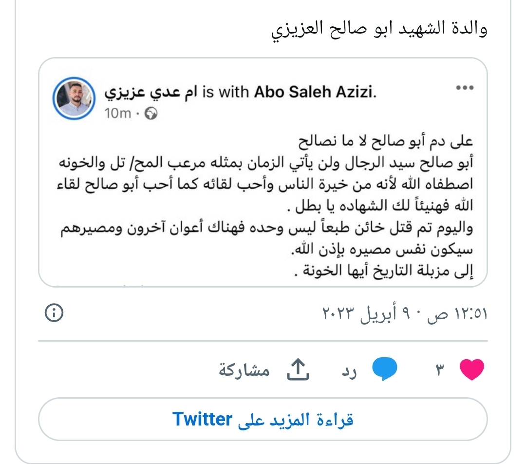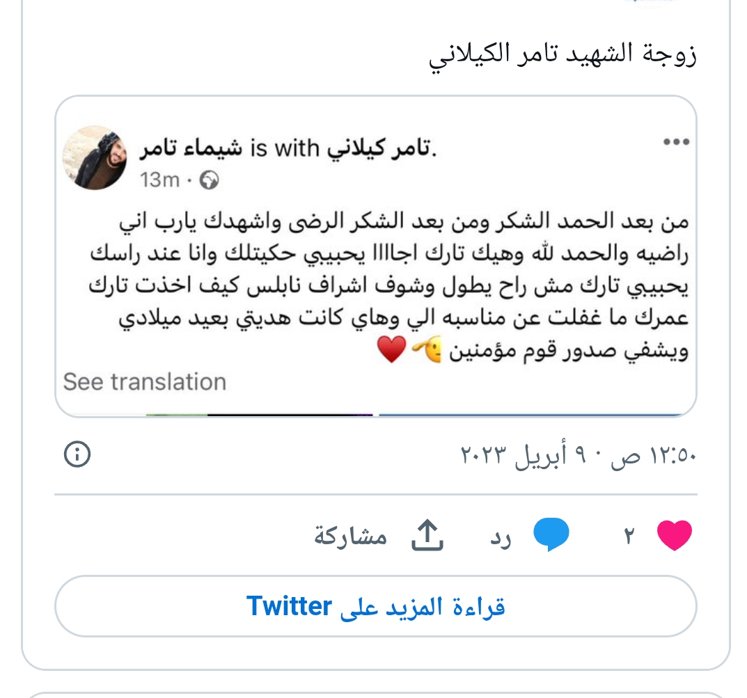 وتابعت “الرصاصة المباركة في رأس الخائن، تنقذ رؤوس الشباب، ودراجة تامر الكيلاني تشهد”.