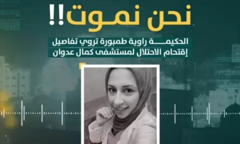 في شهادة صادمة، روت الطبيبة راوية طمبورة مشاهد مروعة أثناء اقتحام قوات الاحتلال الإسرائيلي اليوم الجمعة لمستشفى كمال عدوان شمال قطاع غزة.