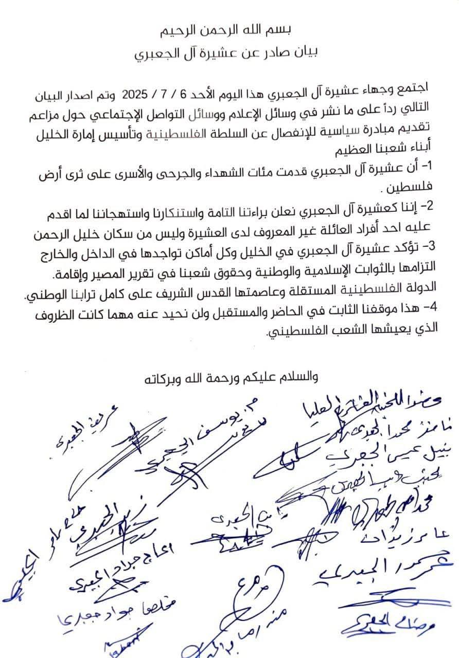 وأكدت عشيرة الجعبري في مدينة الخليل، براءتها الكاملة من المبادرة السياسية التي نُسبت لأحد أفراد العائلة، اوالتي تضمنت الدعوة إلى الانفصال عن السلطة الفلسطينية وتأسيس “إمارة الخليل”، والاعتراف بإسرائيل كدولة يهودية، مؤكدة أن هذه المواقف لا تمثل العائلة ولا تعبّر عن تاريخها الوطني والنضالي.