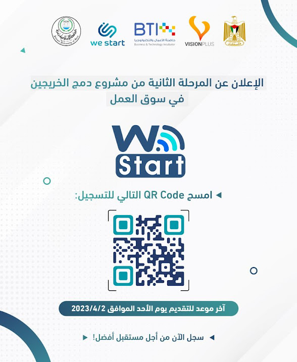 تعلن وزارة الاتصالات وتكنولوجيا المعلومات ووزارة العمل ووزارة المالية عن المرحلة الثانية من مشروع دمج الخريجين في سوق العمل WE START بتمويل حكومي والذي تنفذه حاضنة الأعمال والتكنولوجيا BTI وشركة فيجن بلس، وفق التخصصات التالية: