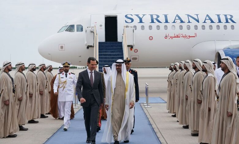 ورافقت طائرة الرئيس السوري لدى دخولها أجواء دولة الإمارات عدة طائرات حربية “ترحيباً بزيارته”.