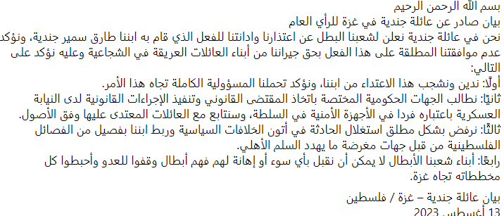 تقدمت عائلة جندية بغزة في بيان للرأي العام بالاعتذار والإدانة للفعل الذي قام به ابننا، ونؤكد عدم موافقتنا المطلقة على هذا الفعل بحق جيراننا.