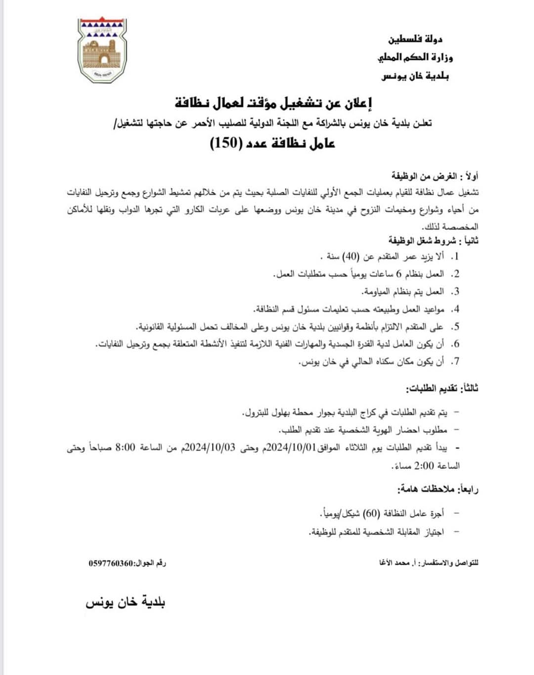 وأوضحت البلدية أنها بحاحة إلى تشغيل (150) عامل نظافة، للعمل في بلدية خان يونس وفق الشروط المُحددة في الإعلان أدناه.