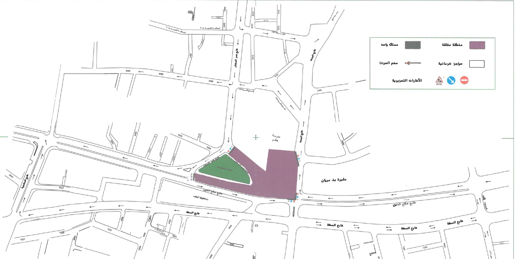 وأوضحت أنّ القادم من شارع بغداد شرقاً والمتجه جنوباً يستمر إلى غرب المفترق ومن ثم يتجه يساراً إلى شارع رشدي الشوا ثم إلى شارع عمر المختار وصولاً إلى شارع صلاح الدين.