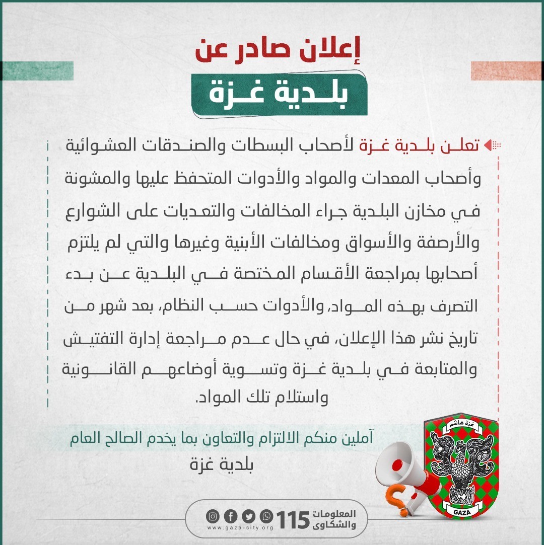 أصدرت بلدية غزة ، يوم الخميس، إعلانًا لأصحاب البسطات والصندقات العشوائية وأصحاب المعدات والمواد والأدوات المتحفظ عليها والمشونة في مخازن البلدية جراء المخالفات والتعديات.