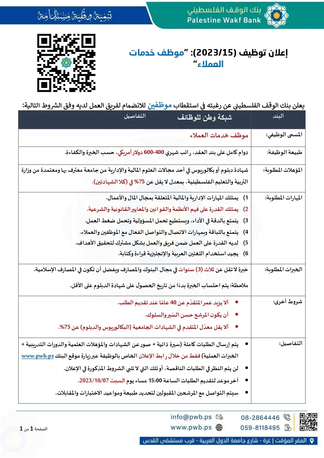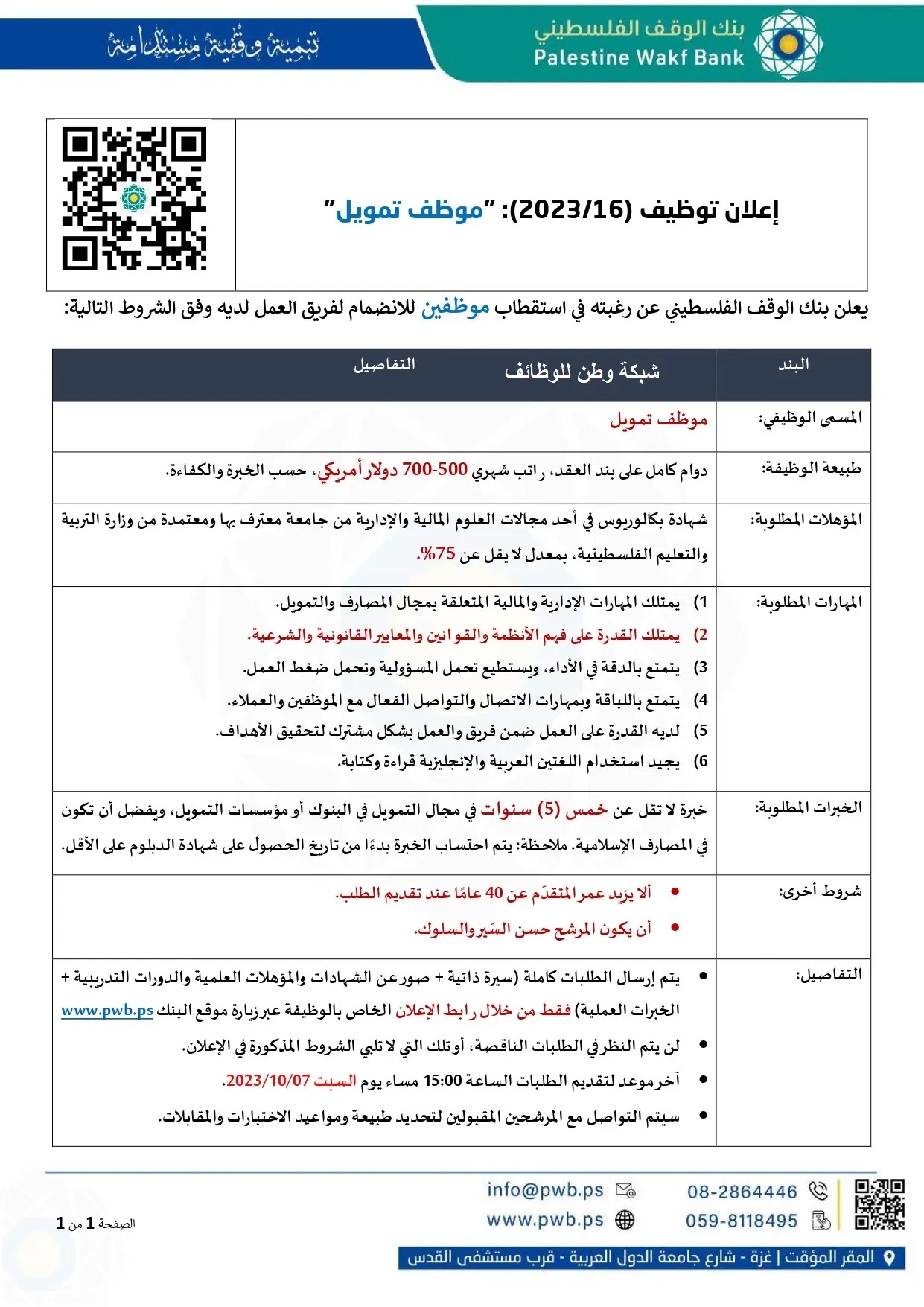 إعلان توظيف صادر عن بنك الوقف الفلسطيني – غزة يعلن فيه عن وظائق شاغرة وفقا لما يلي :