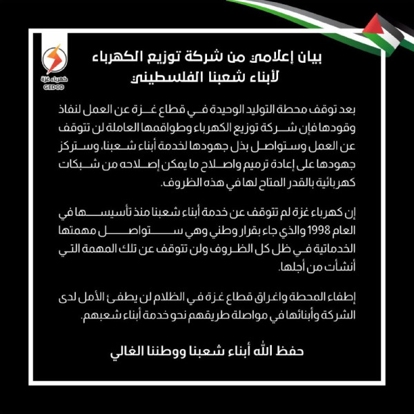 أصدرت شركة توزيع الكهرباء بغزة، مساء اليوم الأربعاء، بياناً، بعد توقف محطة التوليد الوحيدة في القطاع عن