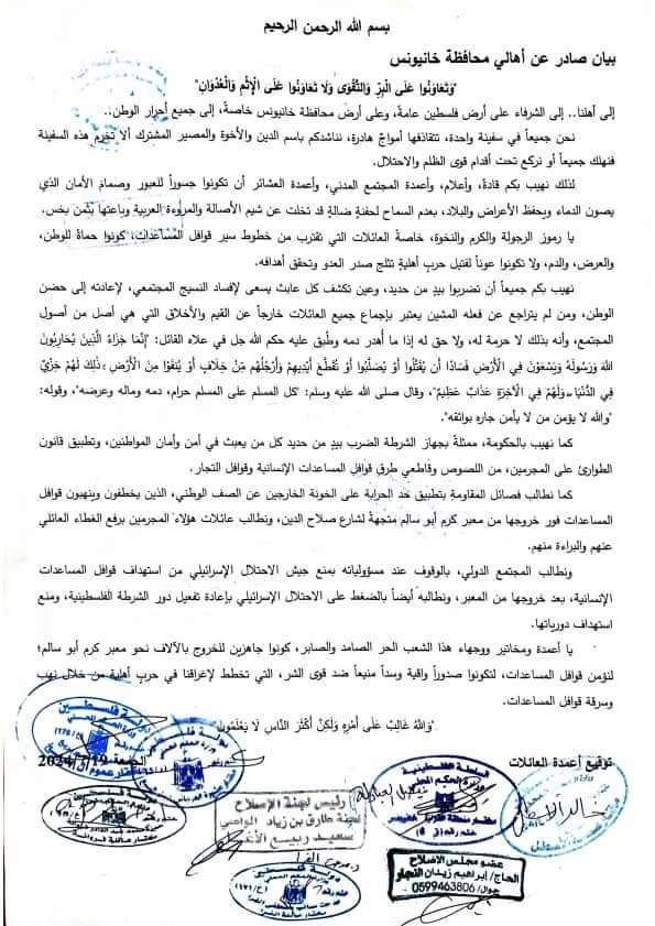 بيان هام صادر عن أهالي محافظة خان يونس جنوبي قطاع غزة