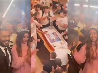 فيما نشرت الصفحة الرسمية لـ«عرب وود» الفيديو عبر حسابها بـ«انستجرام»، وعلقت عليها: «خطوبة تامر حسني وهنا الزاهد وسط الاحتفالات بعيد ميلاده تتصدر التريند.. متحمسين لفيلمه ريستارت».