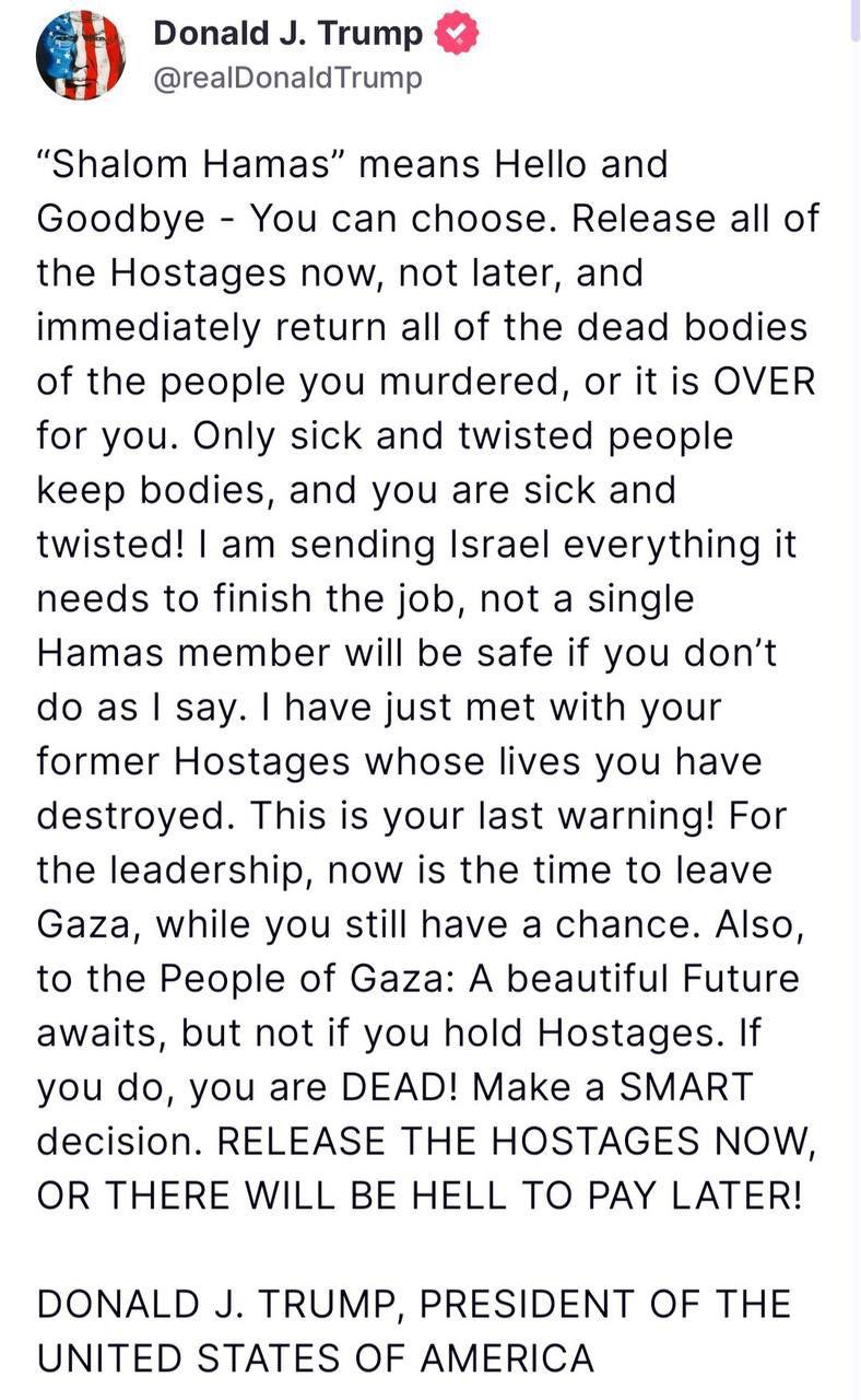 وقال ترامب في منشور عبر حسابه على منصة “سوشيال تروث”: “شالوم حماس تعني مرحبا ووداعا يمكنكم الاختيار، أطلقوا سراح جميع الرهائن الآن، وليس لاحقا، وأعيدوا على الفور جثث جميع الأشخاص الذين قتلتموهم، وإلا فستكون النهاية لكم. فقط الأشخاص المرضى والمشوهون يحتفظون بالجثث، وأنتم مرضى ومشوهون!”.