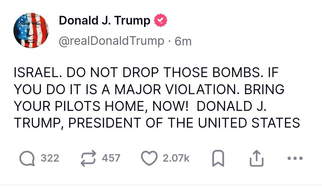 وجّه الرئيس الأميركي دونالد ترامب، الثلاثاء، 24 يونيو 2025، رسالة عاجلة إلى إسرائيل بعدم قصف إيران، وإعادة طياريهم التي أرسلوها لقصف طهران، ردًا على ادّعاءات اختراق الأخيرة لوقف إطلاق النار الذي دخل حيّز التنفيذ صباح اليوم.