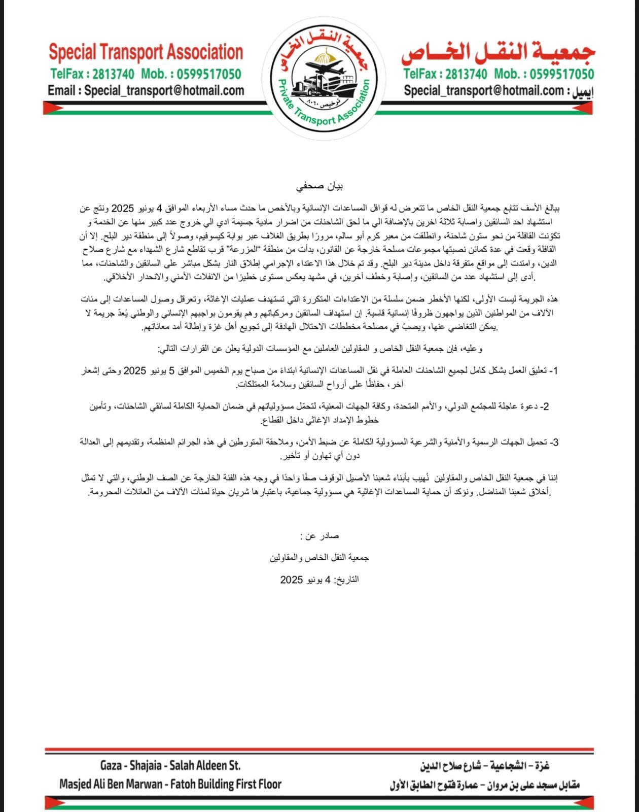 أعلنت جمعية النقل الخاص في قطاع غزة ، اليوم الخميس 5 يونيو 2025، تعليق عمل شاحنات نقل المساعدات في غزة حتى إشعار آخر.