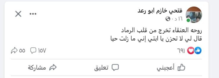 وكتب أبو الرعد عبر حسابه في فيسبوك: “روحه العنقاء تخرج من بين الرماد، قال لي لا تحزن يا ابتي فإني ما زلت حياً”.