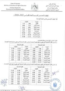 نشرت وزارة التربية والتعليم العالي في غزة، مساء الجمعة، توقيت الحصص الدراسية للعام الدراسي الجديد 2023-2024، المقرر انطلاقه يوم غد السبت.
