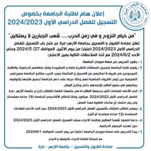 أعلنت جامعة الأزهر في قطاع غزة عن فتح باب التسجيل للطلبة للفصل الدراسي الأول 2023/2024 وفيما يلي نص الاعلان كما وصلنا