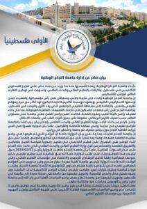 أصدرت جامعة النجاح الوطنية، اليوم الخميس، بياناً رداً على تصريح وزارة التعليم العالي، بشأن فرع روابي.
