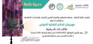 أعلنت كلية الإعلام بجامعة فلسطين وبالتعاون مع المركز العربي للأبحاث بعقد مهرجان أفلام الطلبة الدولي طاقات شبابية بهدف تشجيع المواهب الشابة على تقديم رؤيتهم للعالم.