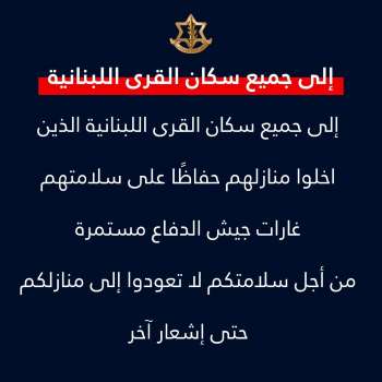 الجيش الاسرائيلي لسكان القرى اللبنانية: أخلوا البيوت التي خبأ فيها حزب الله اسحلته والغارات ستبدأ في المدى الزمني الوشيك الجيش الاسرائيلي لسكان القرى اللبنانية: