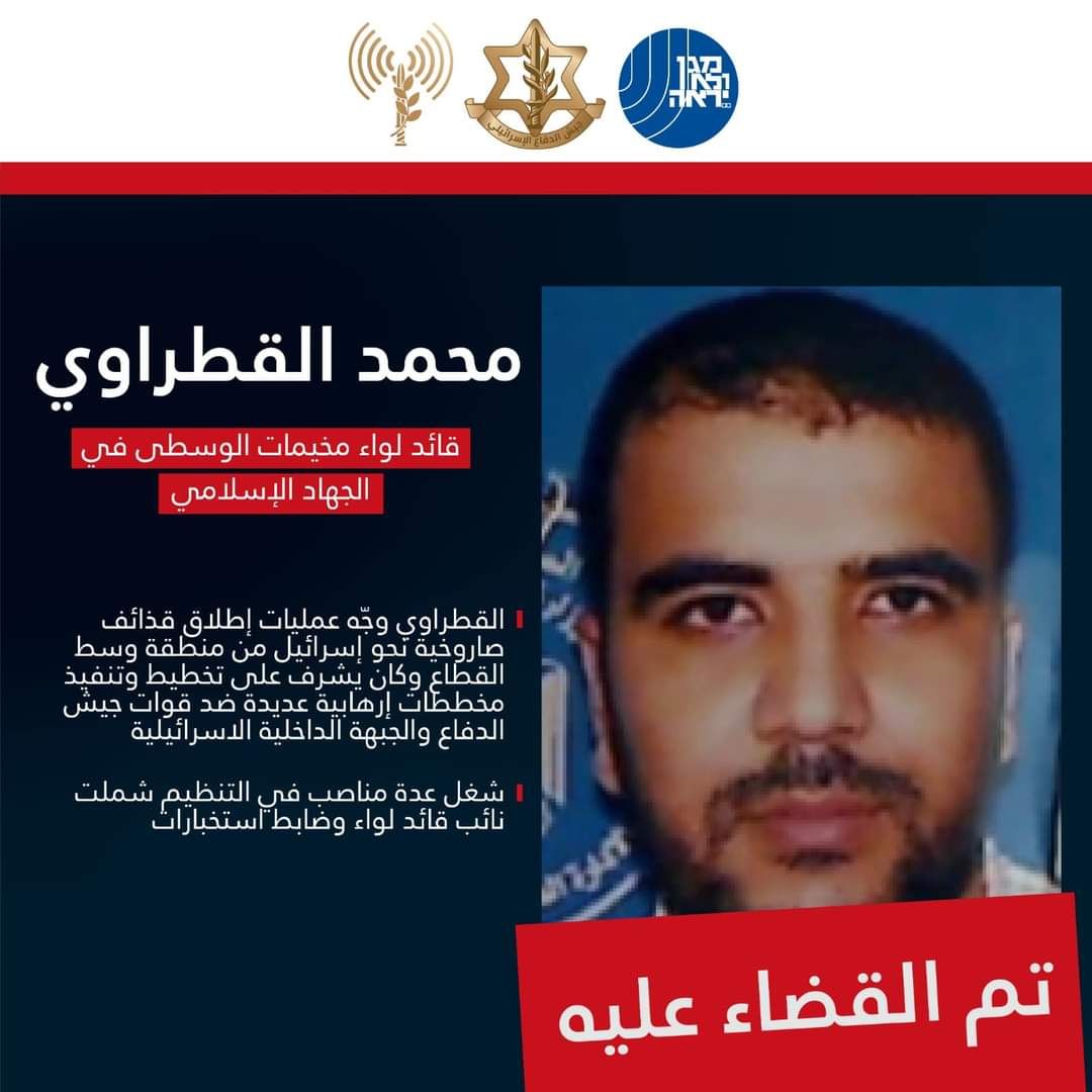 أعلن الجيش الإسرائيلي، وجهاز الأمن الداخلي (الشاباك)، في بيان مشترك السبت، اغتيال محمد القطراوي، الذي قالا إنه “قائد لواء مخيمات الوسطى في تنظيم الجهاد”.