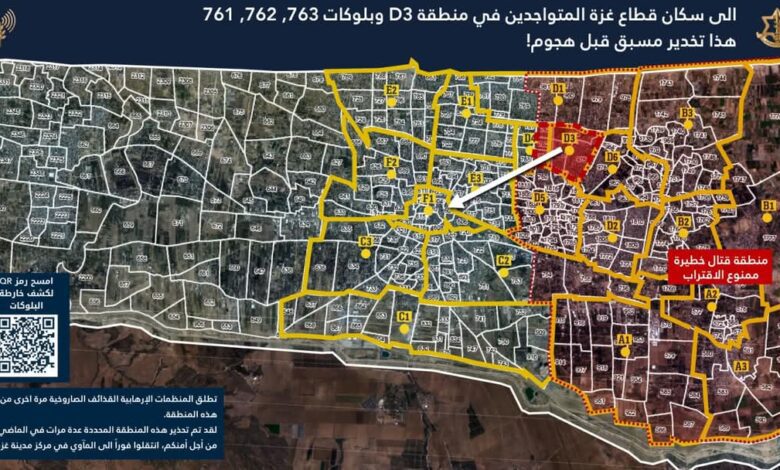 ووجه الجيش الإسرائيلي، تحذيرا عاجلا إلى سكان قطاع غزة المتواجدين بالمنطقة D3، منطقة جباليا وعلى وجه الخصوص في البلوكات 761 و762 و763.
