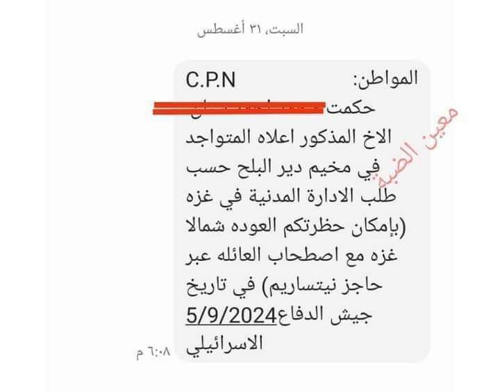 أثارت رسالة متداولة قيل أنها وصلت من قبل جيش الاحتلال الإسرائيلي لمواطن يدعى حكمت يطلب منه العودة من جنوب قطاع غزة إلى شماله.