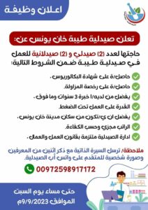 وبحسب الإعلان فإن الصيدلية تحتاج لـ2 صيادلة ذكور ة2 صيادلة إناث، وذلك وفق الشروط التالية: