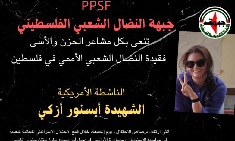 اعتبر عضو اللجنة التنفيذية لمنظمة التحرير الفلسطينية الامين العام لجبهة النضال الشعبي الفلسطيني د.أحمد مجدلاني، قتل الاحتلال الإسرائيلي للمتضامنة الأمريكية المناهضة للجدار والاستيطان أيسينور إزجي إيجي Aysenur Ezgi Eygi، بعد إصابتها بالرصاص الحي في الرأس، اليوم الجمعة خلال مشاركتها مع متضامنين أجانب آخرين في مسيرة مناهضة للاستيطان في جبل صبيح ببلدة بيتا جنوب نابلس، تمادي في الجرائم المتواصلة ضد شعبنا وكل من يتضامن مع قضيته وهي ليست المرة الأولى التي يستهدف بها الاحتلال المتضامنين الاجانب .