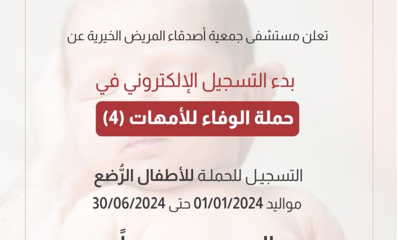 أعلن مستشفى جمعية أصدقاء المريض الخيرية عن بدء التسجيل الإلكتروني في حملة الأمهات المرضعات (النسخة الرابعة) لتوزيع الحليب.