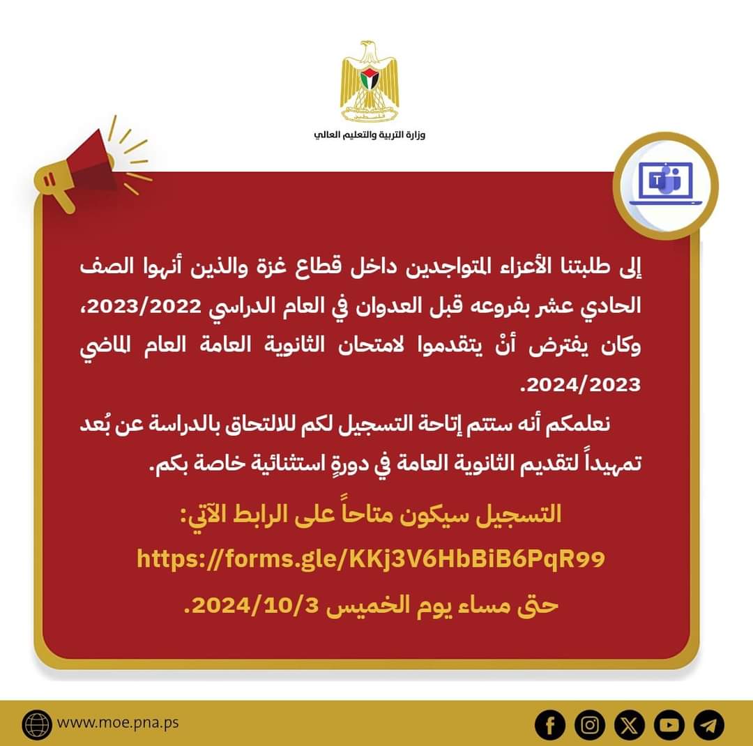اعلنت وزارة التربية والتعليم عن اطلاق رابط تسجيل لطلاب الثانوية العامة والذين انهوا الصف الحادي عشر بفرعيه قبل العدوان الإسرائيلي .