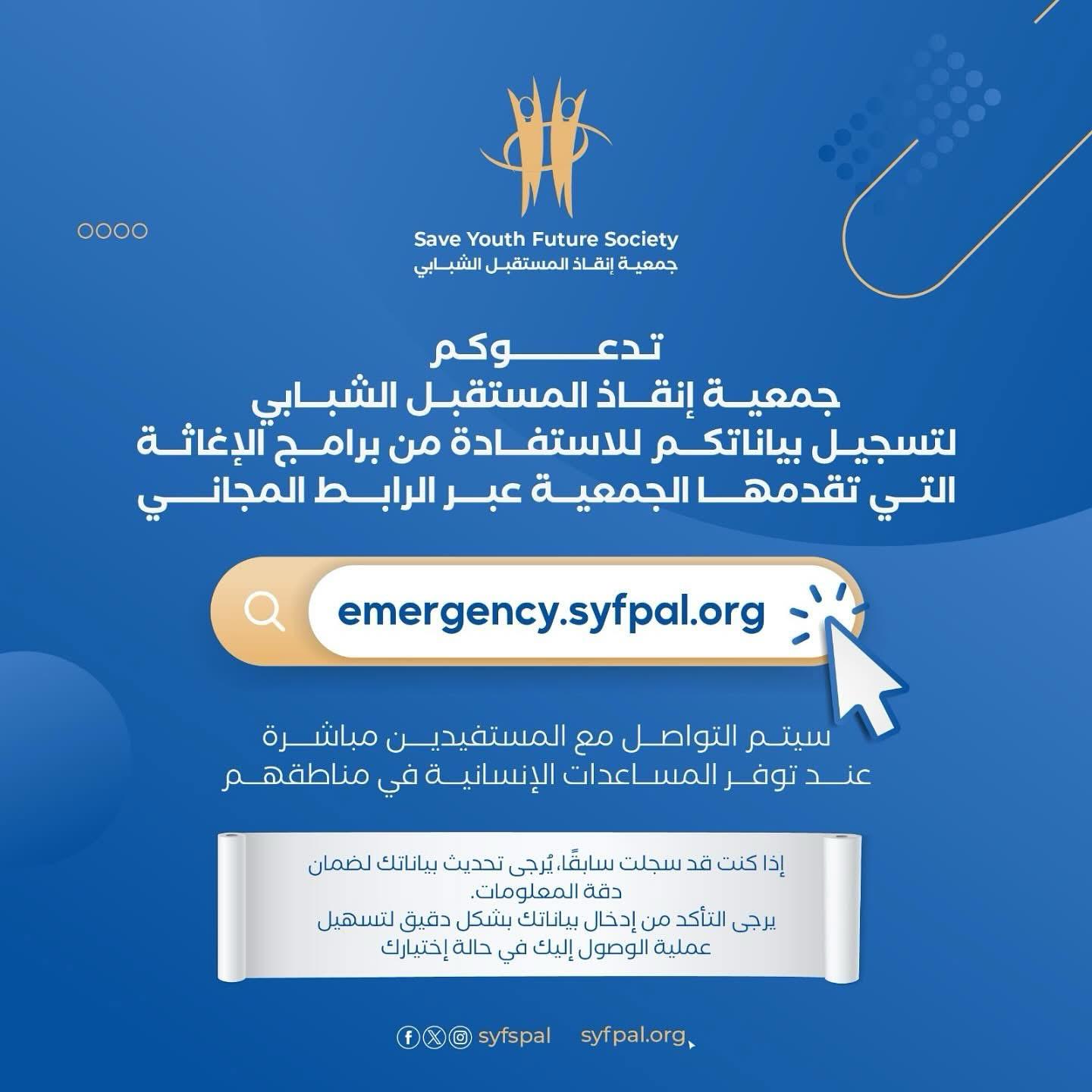 تعلن جمعية إنقاذ المستقبل الشبابي عن فتح باب تسجيل وتحديث البيانات للاستفادة من برامج الإغاثة التي تقدمها، مؤكدة على أهمية تحديث المعلومات لضمان وصول المساعدات الإنسانية إلى مستحقيها في مختلف المناطق.