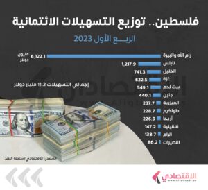 الحصة الأكبر للضفة الغربية للضفة بـ10.2مليار دولار، ولقطاع غزة، 992 مليون دولار حتى نهاية الربع الأول 2023..