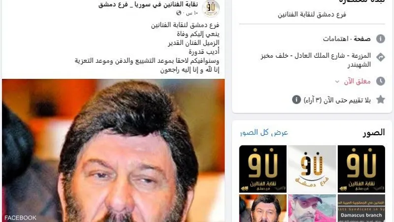 وأعلنت نقابة الفنانين السوريين – فرع دمشق نبأ الوفاة، مشيرة إلى أن الفنان الراحل فارق الحياة بعد معاناة مع وعكة صحية شديدة ألمّت به مؤخراً وألزمته المنزل.
