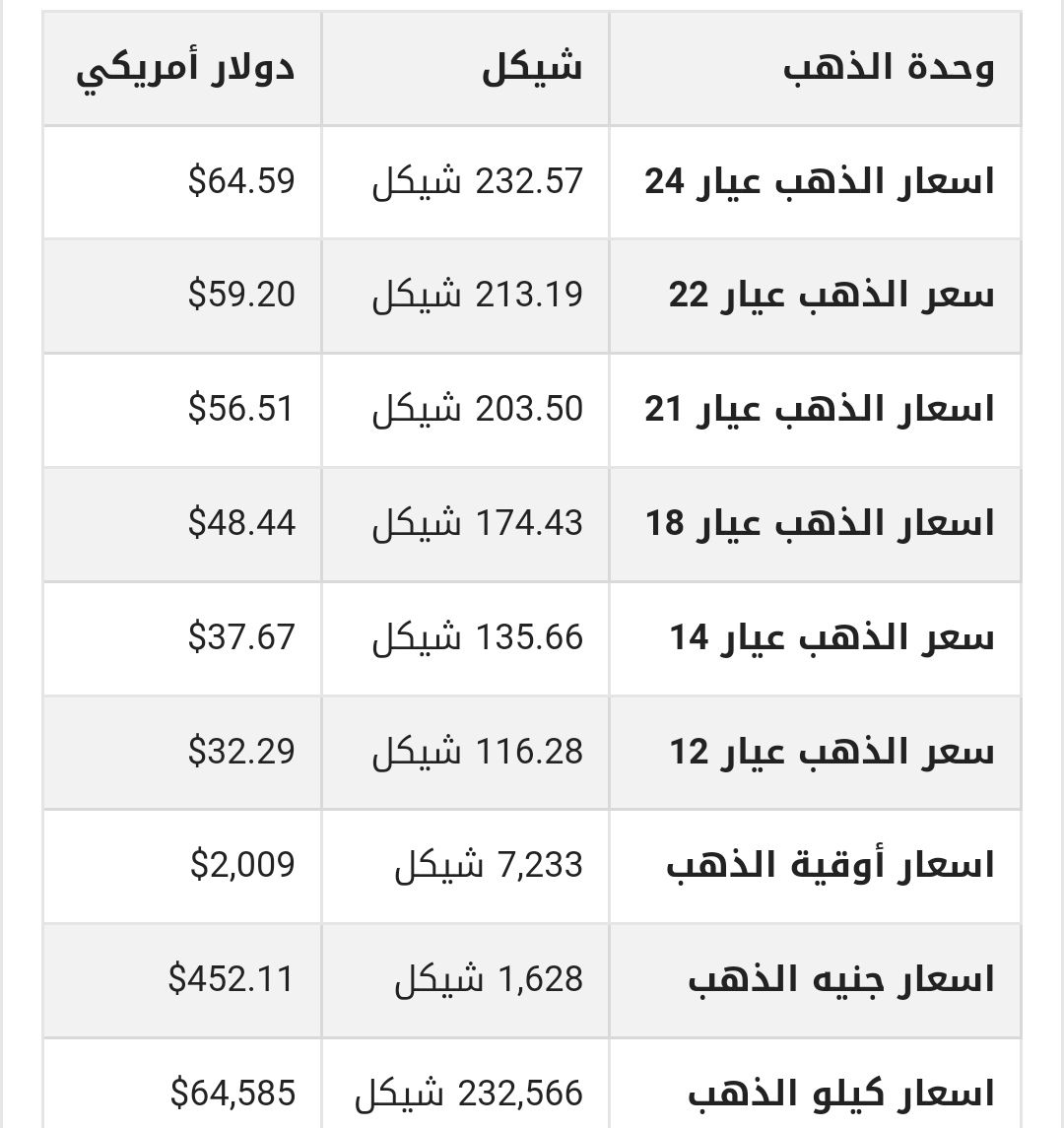 ننشر لكم أسعار الذهب في الأسواق الفلسطينية، اليوم الإثنين 10 أبريل 2023، وفقًا للشيكل الإسرائيلي والدولار الأمريكي ، حيث جاءت على النحو التالي:
