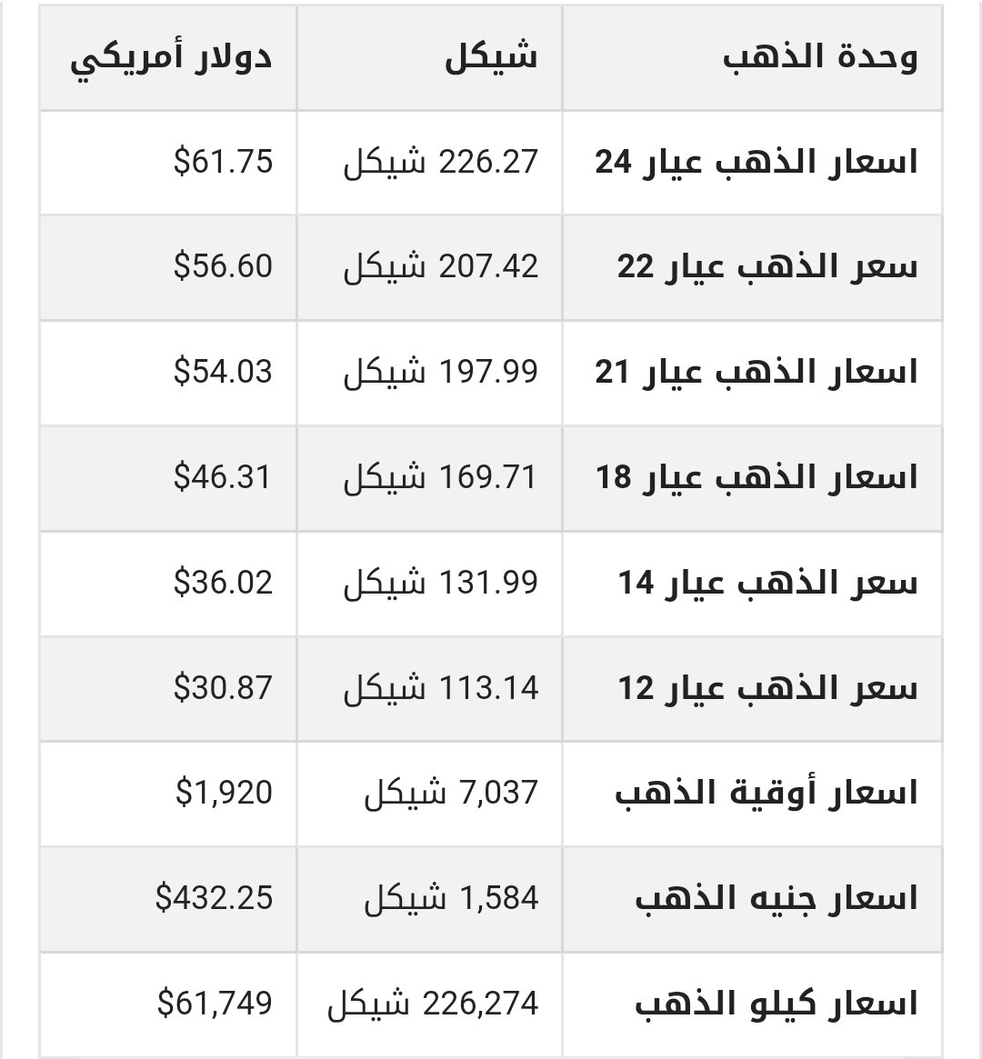 جاءت أسعار الذهب في أسواق فلسطين، اليوم الجمعة 17 مارس 2023 وفقًا للشيكل “الإسرائيلي” والدولار الأمريكي، على النحو التالي: –