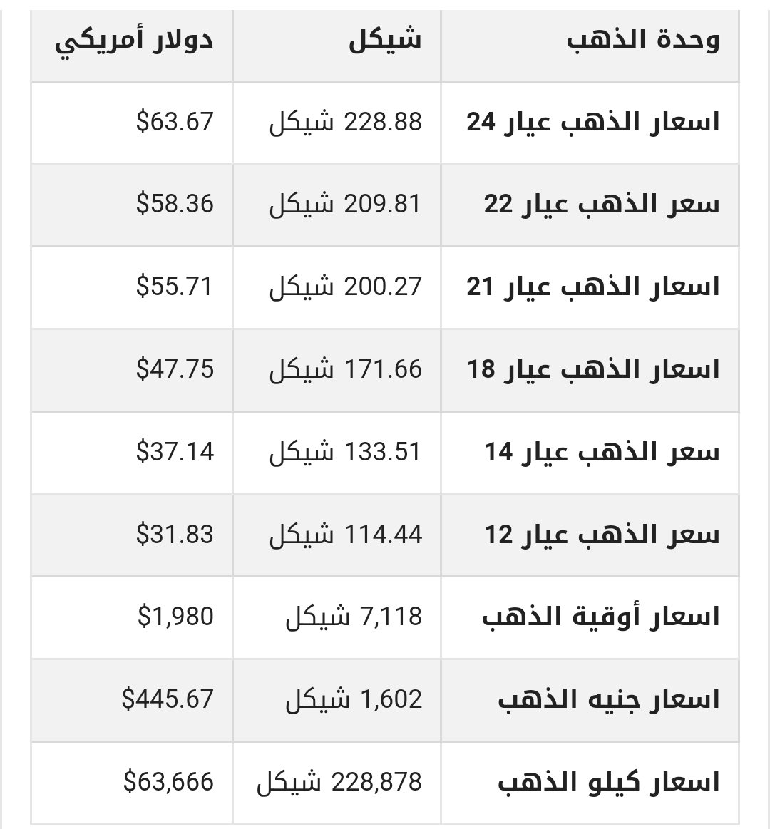 جاءت أسعار الذهب في أسواق فلسطين، اليوم السبت 25 مارس 2023 وفقًا للشيكل “الإسرائيلي” والدولار الأمريكي، على النحو التالي: