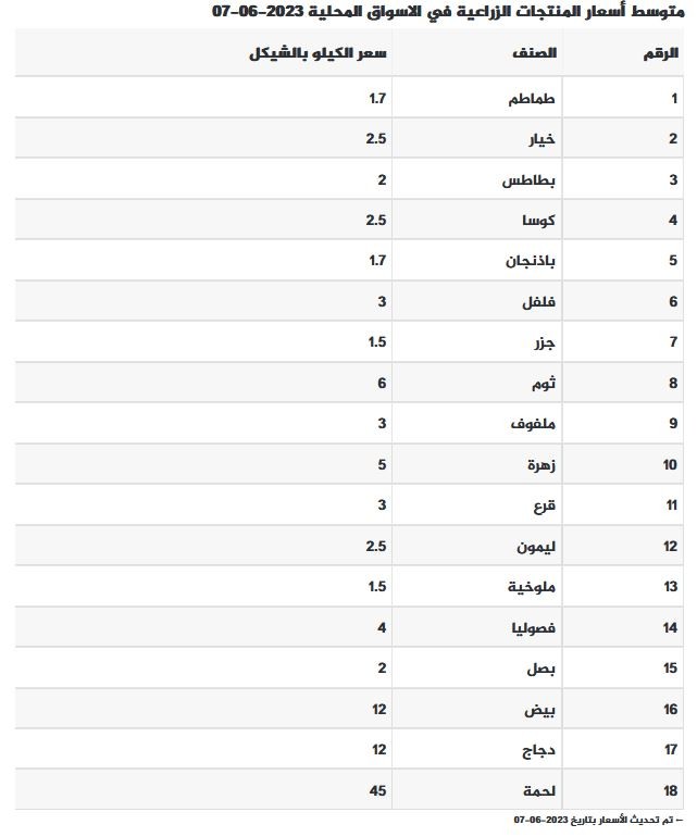 جاءت أسعار الخضروات والدجاج والبيض واللحوم في أسواق غزة اليوم الأربعاء 7 يونيو 2023 عالنحو الآتي:
