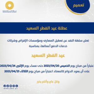 وقالت سلطة النقد: “إن المصارف ومؤسسات الإقراض وشركات خدمات الدفع ستعطل أعمالها اعتباراً من صباح يوم الخميس 20/4 حتى مساء الإثنين 24/4، على أن يعود الدوام المعتاد اعتبارًا من صباح يوم الثلاثاء 25/4”.