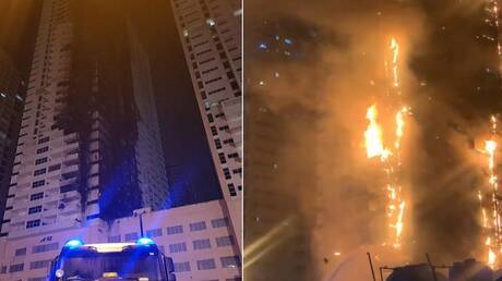 شاهد: اندلاع حريق ضخم في برج سكني بعجمان في الإمارات
