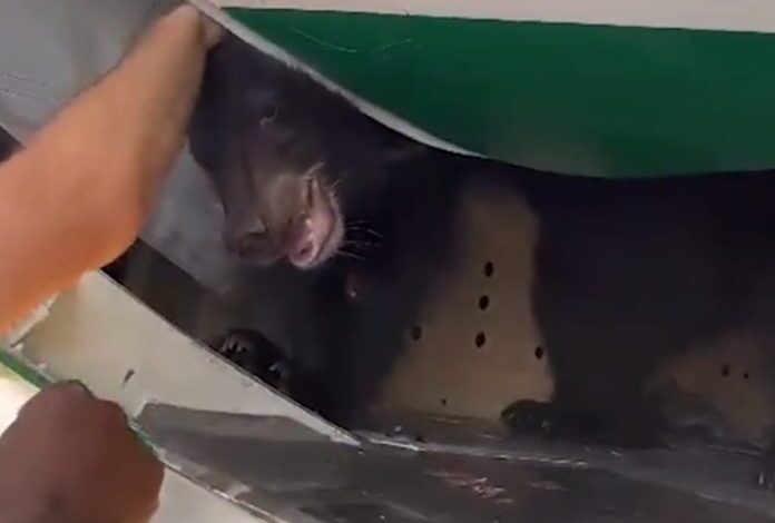 وأظهر مقطع فيديو محاولة أفراد أمن ومتخصصن تهدئة الدب ومحاولة إرجاعه للقفص على متن الطائرة بعد تمكن من الإفلات، ما أثار هلع وفزع المسافرين.