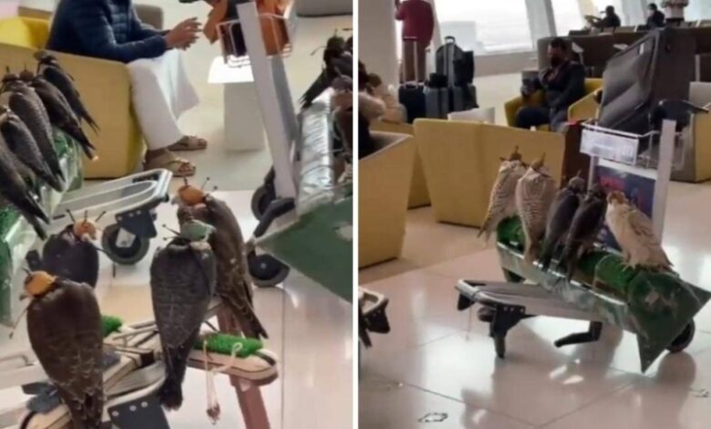 شاهد .. ثري خليجي يصطحب معه عشرات الصقور في مطار البحرين