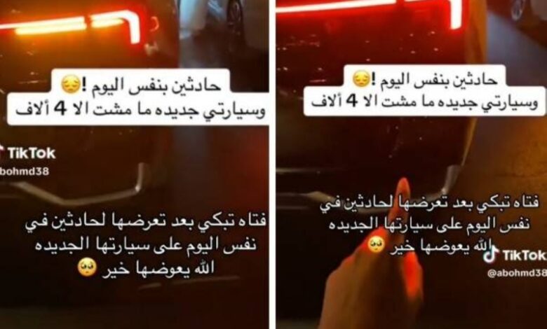 وثق مقطع فيديو، فتاة تبكي بعد تعرضها لحادثين سير بسيارتها الجديدة في نفس اليوم، حيث رددت، قائلة:”ياربي لاحول ولا قوة إلا بالله”.