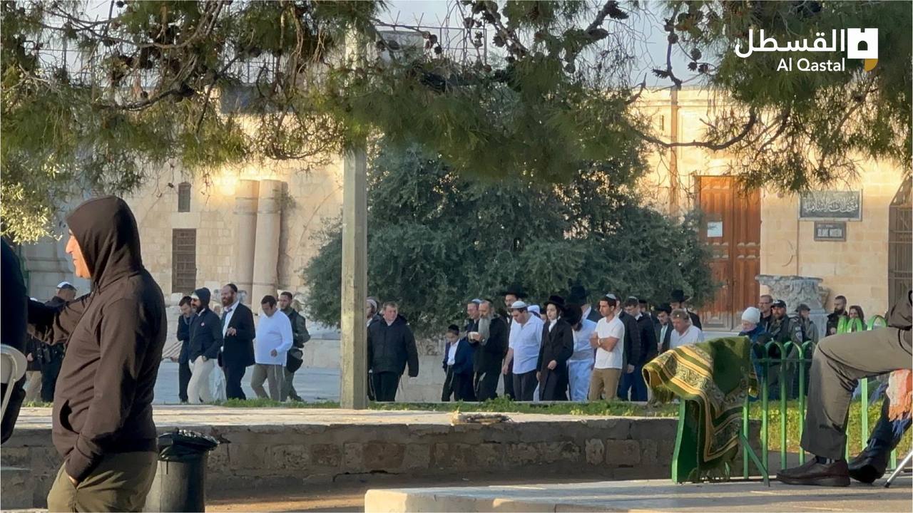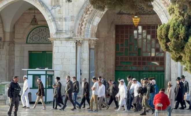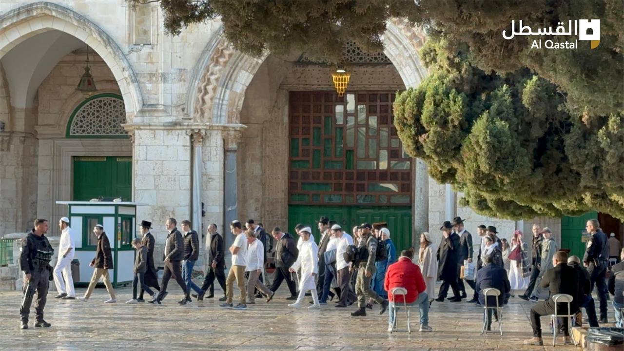 وأكدت مصادر محلية، ان مجموعات من المستوطنين اقتحمت باحات المسجد الأقصى على دفعات متتالية من جهة باب المغاربة بحراسة مشددة لقوات الاحتلال الإسرائيلي والوحدات الخاصة التي انتشرت في ساحات الأقصى للحراسة.