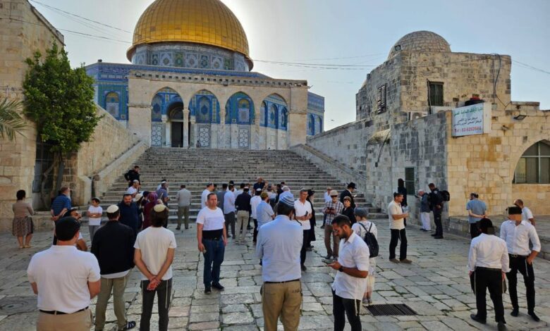 وانتشرت قوات الاحتلال في باحات المسجد الأقصى، لتأمين اقتحامات المستوطنين الاستفزازية وجولاتهم، وذلك بعد دعوة “جماعات الهيكل” ، إلى تنفيذ اقتحامات جماعية للأقصى.