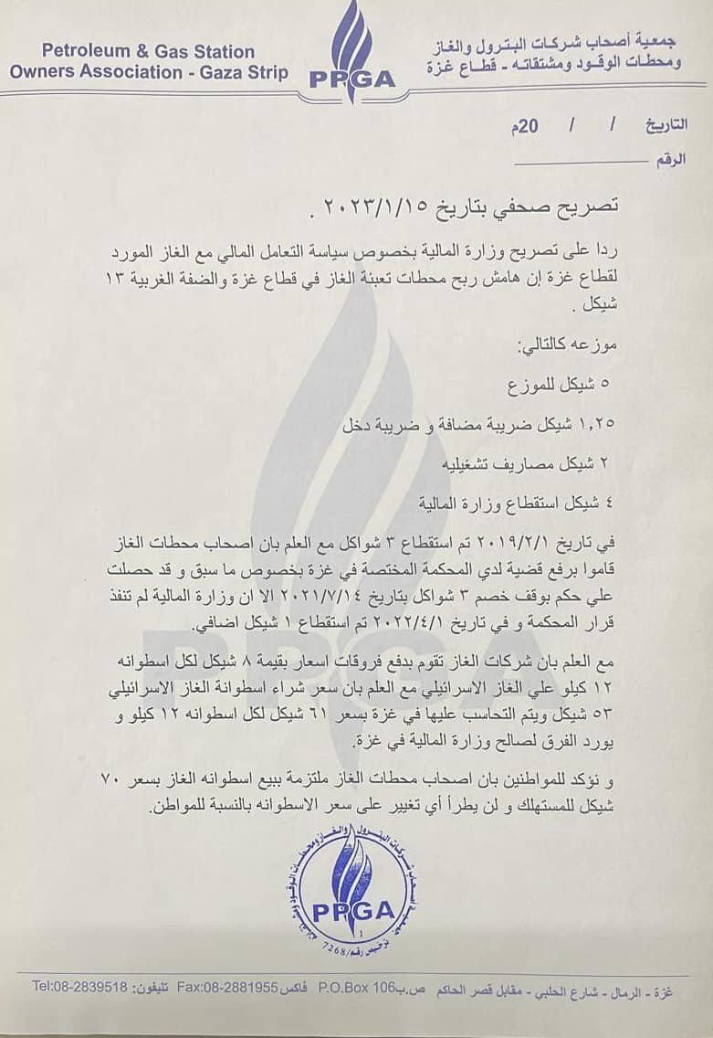 أصدرت جميعة أصحاب شركات البترول والغاز في قطاع غزة ، مساء اليوم الأحد 15 يناير 2023، بياناً صحفياً ردت من خلاله على تصريح وزارة المالية في غزة بخصوص سياسة التعامل المالي مع الغاز المورد للقطاع.