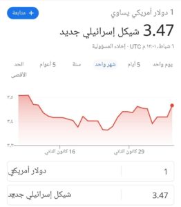 صعد سعر صرف الدولار الامريكي، مقابل الشيكل الاسرائيلي، بعد ظهر اليوم الاثنين، 6 فبراير 2023، بشكل حاد.