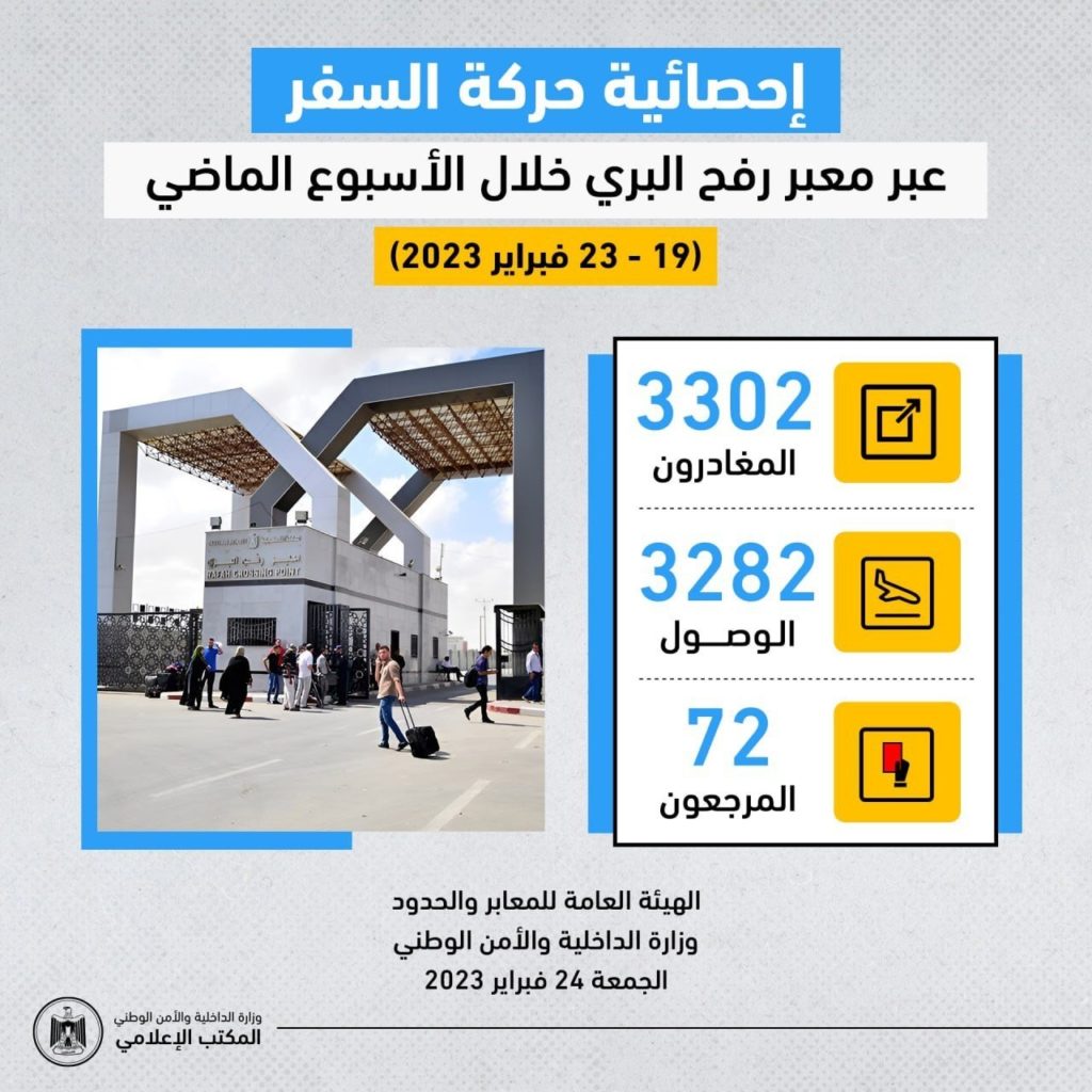 صورة: إحصائية عمل معبر رفح خلال الأسبوع الماضي “19-23 فبراير 2023”