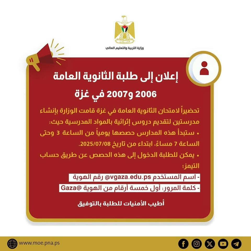 وأكدت الوزارة أن هذه الخطوة تأتي في إطار حرصها على توفير الدعم الأكاديمي اللازم للطلبة في ظل الظروف الاستثنائية التي يمر بها القطاع، متمنيةً لجميع الطلبة التوفيق والنجاح في امتحاناتهم المقبلة.
